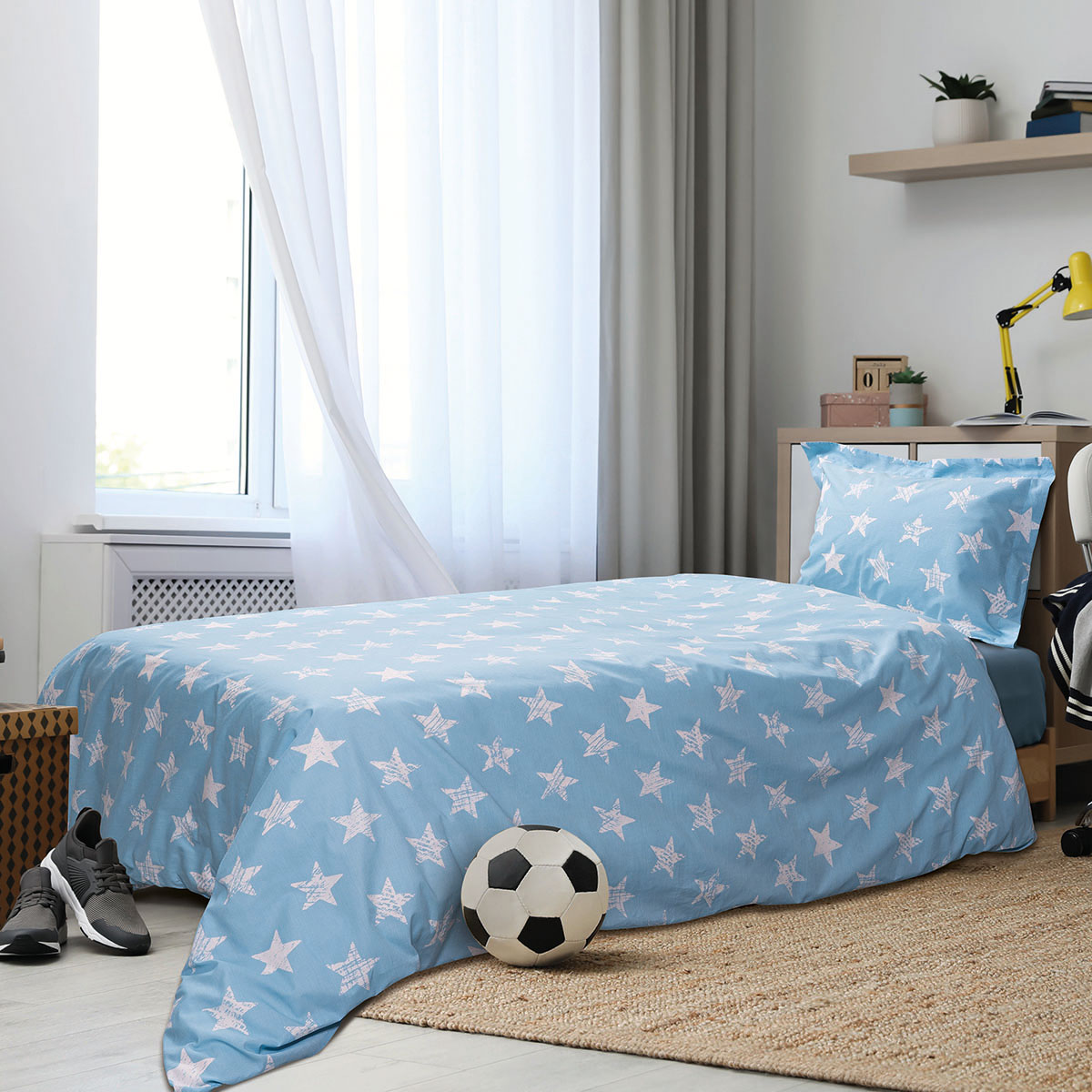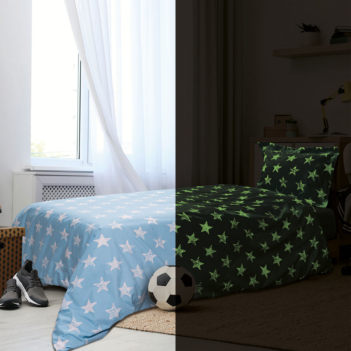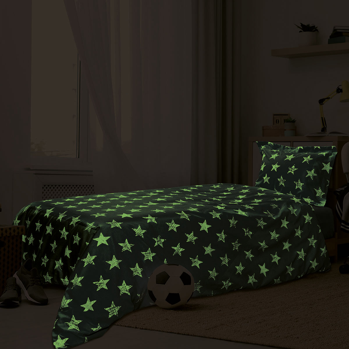 Σετ σεντόνια μονά φωσφοριζέ Gaspar . Το σετ περιλαμβάνει 1 τεμάχιο σε διάσταση 170×240 και 1 τεμάχιο μαξιλαροθήκη σε διάσταση 50×70 .